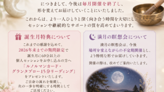 お知らせお知らせ 【大切なお知らせ】いつもありがとうございます。これまで毎月開催しておりました・勾玉磨き(御霊月祭)・満月の瞑想会につきまして、今後は毎月開催を終了し、形を変えてお届けしていくことにいたしました。これからは、より一人ひとりと深く向き合う時間を...2026.04.26お知らせ